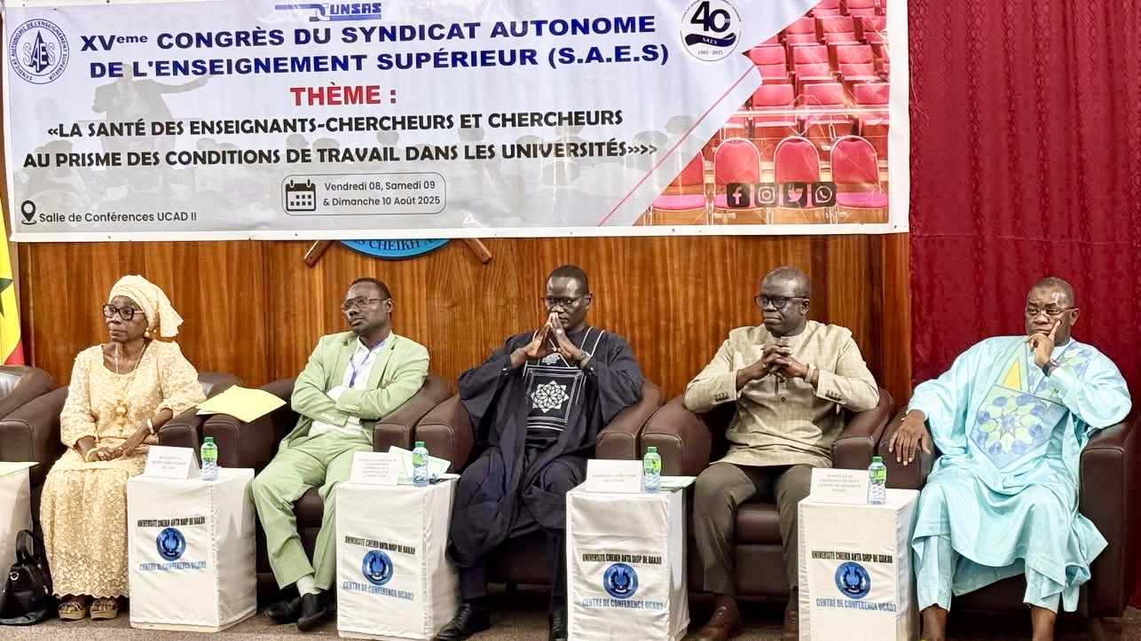 Le Ministre de l’Enseignement supérieur, de la Recherche et de l’Innovation a présidé ce vendredi 8 août placé sous le thème « La santé des enseignants-chercheurs et chercheurs au prisme des conditions de travail dans les universités », couplé à la célébration du 40ᵉ anniversaire du syndicat, à l’Auditorium de l’UCAD II. Il a rendu un hommage appuyé au SAES pour quatre décennies d’engagement, de militantisme constructif et de contribution au développement d’une université plus juste, autonome et performante, saluant un syndicalisme responsable et éclairé.